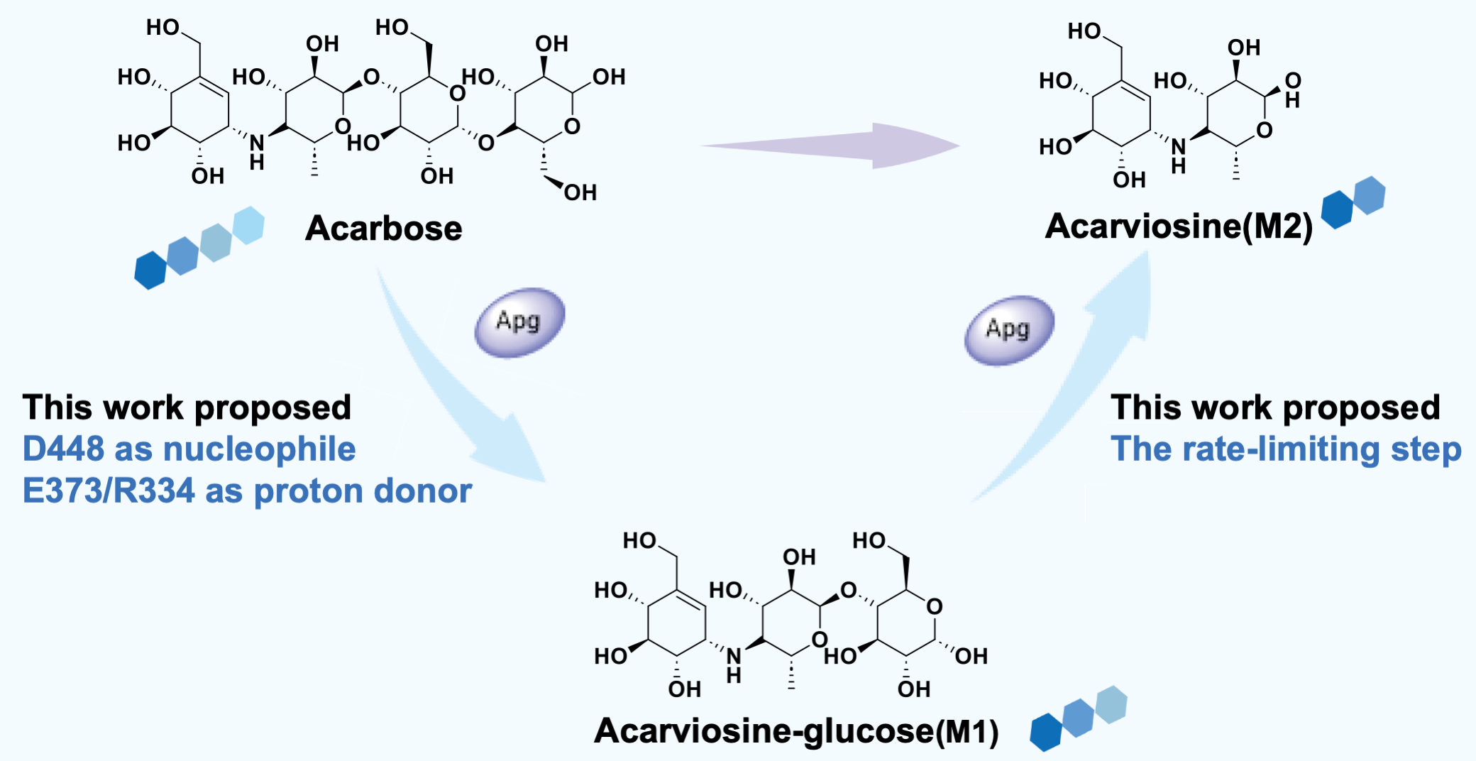 In this study, the researchers combined high-resolution structural analysis, biochemical experiments, and multiscale computational simulations to comprehensively elucidates the molecular mechanism by which Apg degrades acarbose. They first identified D448 as the key nucleophile, rather than D336 as previously assumed. Then they revealed that both E373 and R334 can function as substrate donors. Their findings demonstrate that acarbose degradation proceeds via a two-step mechanism involving an M1 intermediate, with the second-step hydrolysis being the rate-limiting step.