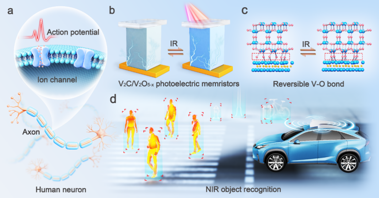 Schematic illustration of a 2D vanadium carbide/oxide heterostructure-based artificial sensory neuron for multi-color near-infrared object recognition. (Image by SIAT)