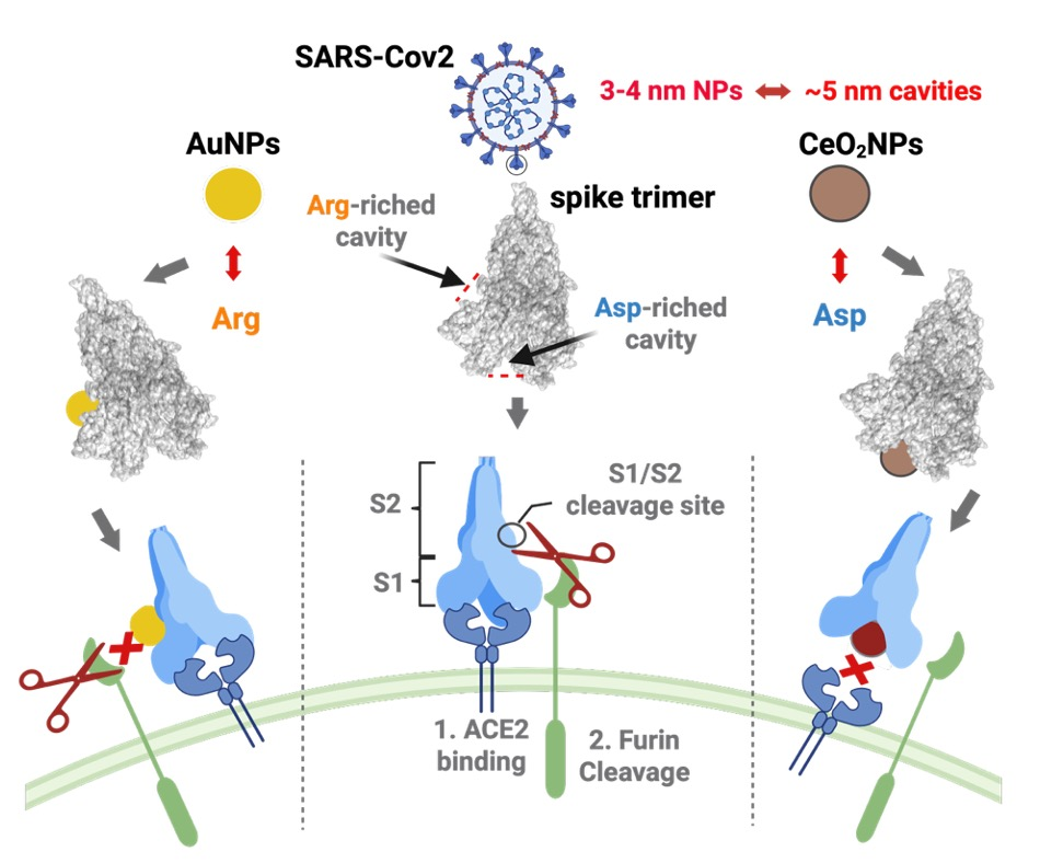 Using SARS-CoV-2 S trimer (S trimer) as a model system, researchers compared CeO2NPs and gold nanoparticles (AuNPs) to evaluate the role of surface chemistry in protein cavity targeting, which have comparable sizes but different surface chemistries. They found that both NPs interacted with the S trimer and exhibited antiviral effects, but differed in their preferred binding sites and molecular mechanisms.