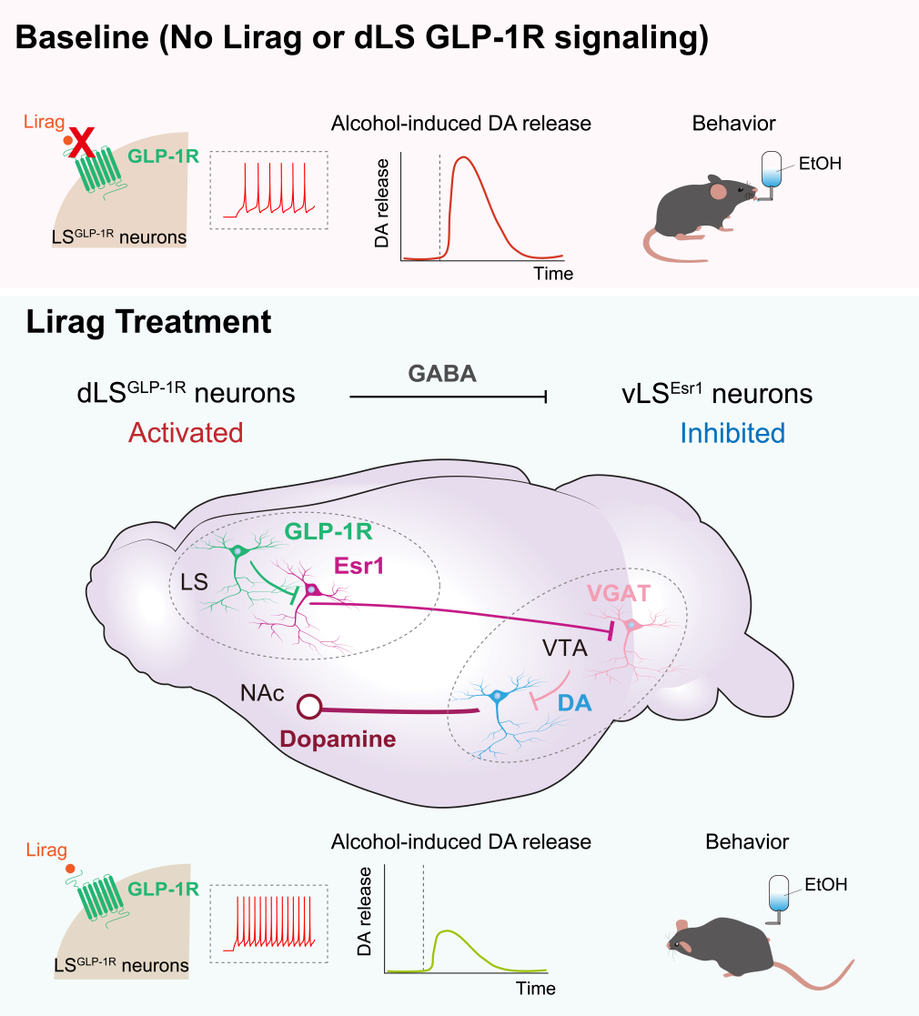 Using the mouse model, researchers found that the GLP-1R agonist liraglutide inhibited alcohol-induced reward signal and reduced alcohol intake by activating GLP-1R neurons in the lateral septum (LS). They revealed an inhibitory microcircuit within the LS projecting from the dorsal LS (dLS) to the ventral LS (vLS): GLP-1R neurons in the dLS directly inhibited neurons expressing estrogen receptor 1 (Esr1) in the vLS through GABAergic synapses.