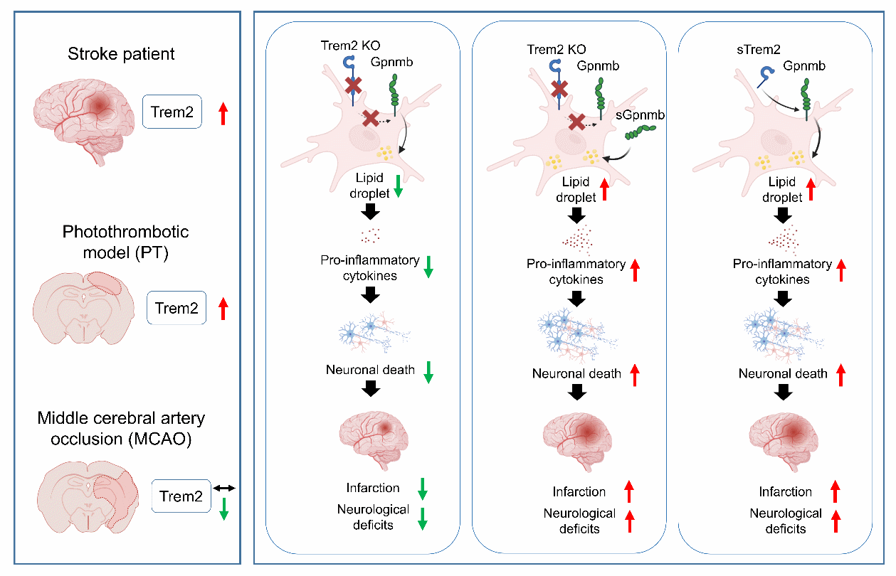 Integrated transcriptomic analyses identified Gpnmb as a conserved downstream effector of Trem2. Functional validation confirmed that soluble Gpnmb counteracted the protective effects of Trem2 deficiency, while clinical data suggested that circulating Trem2 and Gpnmb might serve as the biomarkers of stroke severity.
